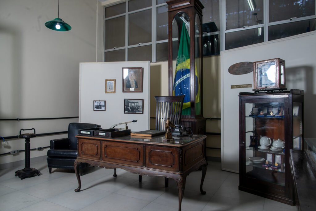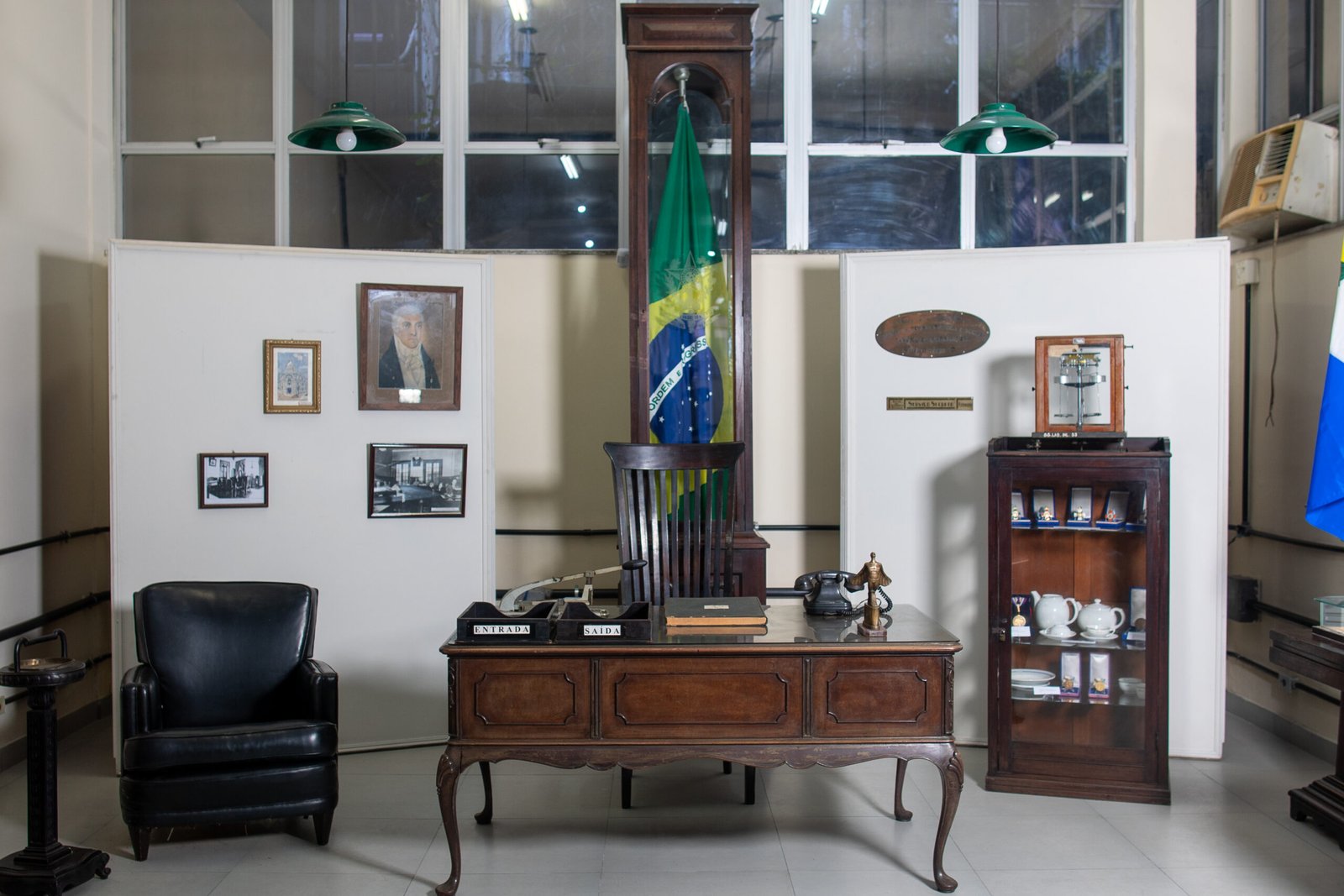 A65I0102 A65I0109 A65I0165 A65I0102 A65I0109 A65I0165 DescriçãoMobiliário de Gabinete de polícia com mesa e objetos de trabalho, cadeira, poltrona e armário com utensílios e insíginias. Ao fundo móvel com bandeira do Brasil, na parede quadros, fotografias e placa.TagsMobiliárioData / períodoSéc. XX Compartilhe