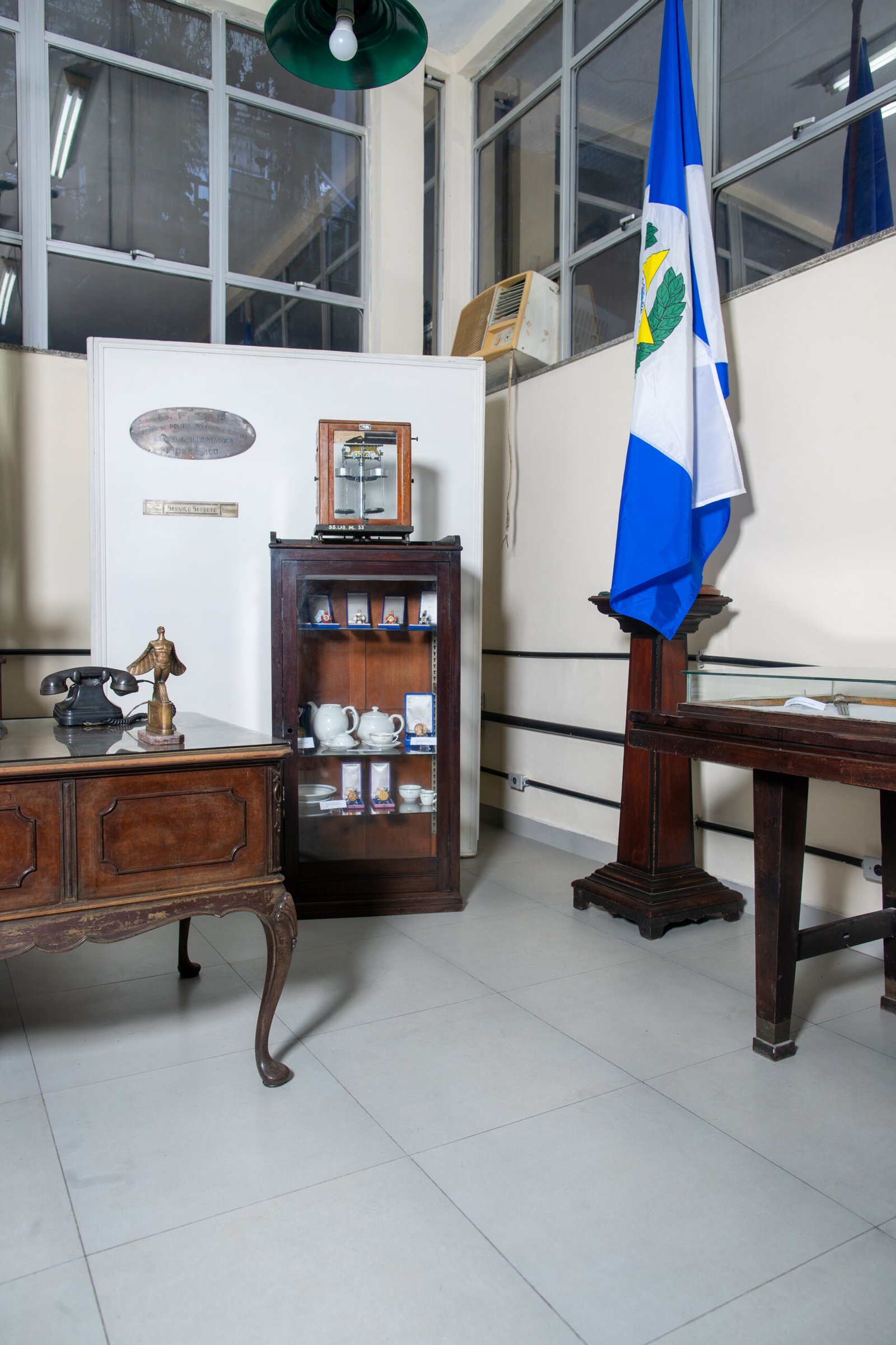 A65I0133 DescriçãoArmário vitrine com insígnias e em cima uma balança. Ao fundo placas dos setores. Ao lado bandeira da Polícia Civil do Estado do Rio de Janeiro.TagsMobiliárioData / períodoSéc. XX Compartilhe