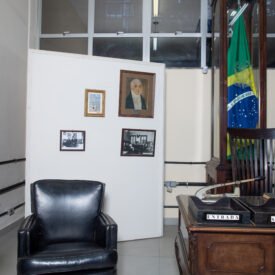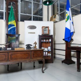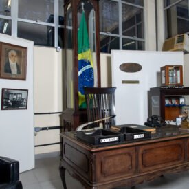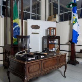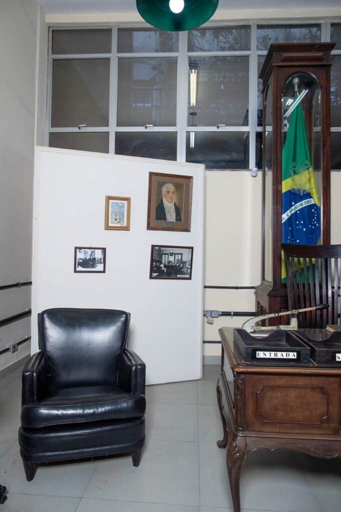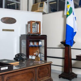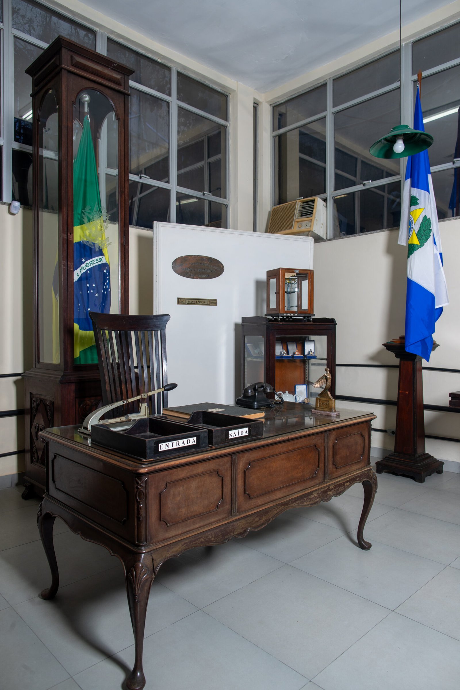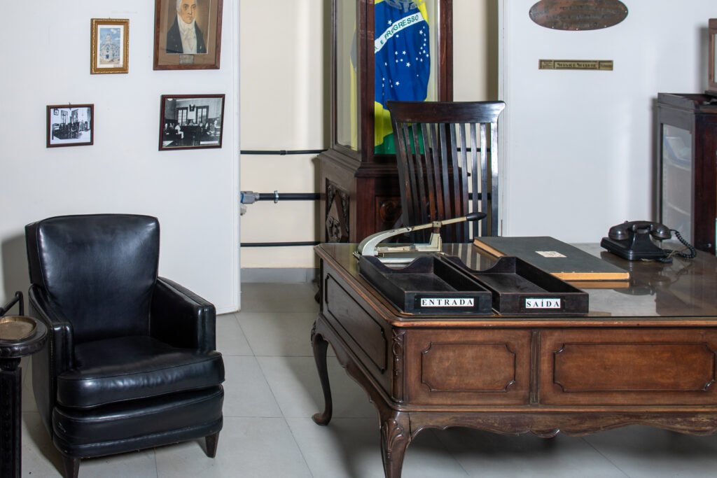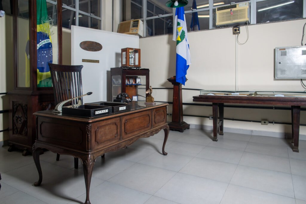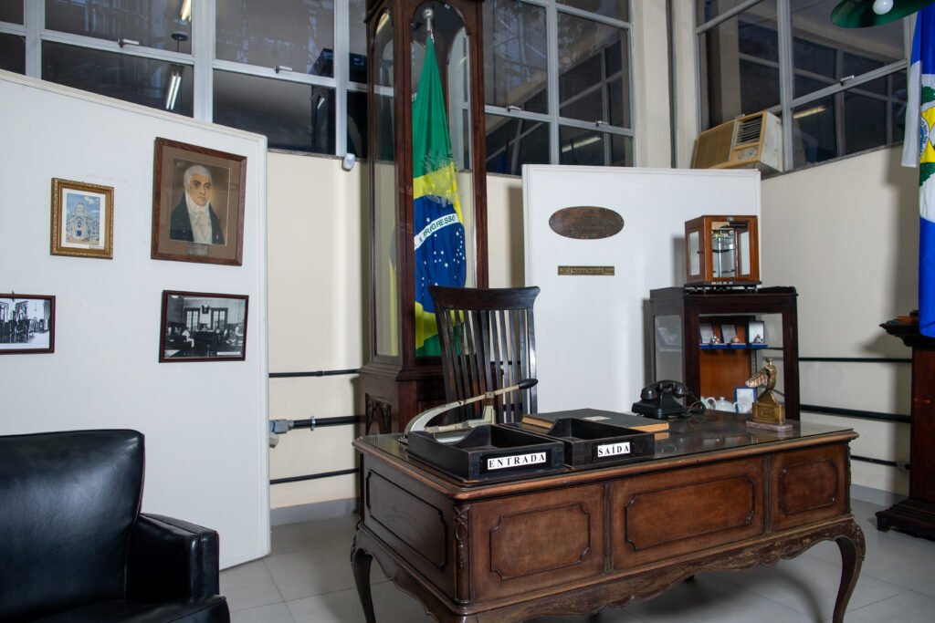 Representação do Gabinete de Polícia, destaque para parte de objetos na mesa, armário e bandeira.