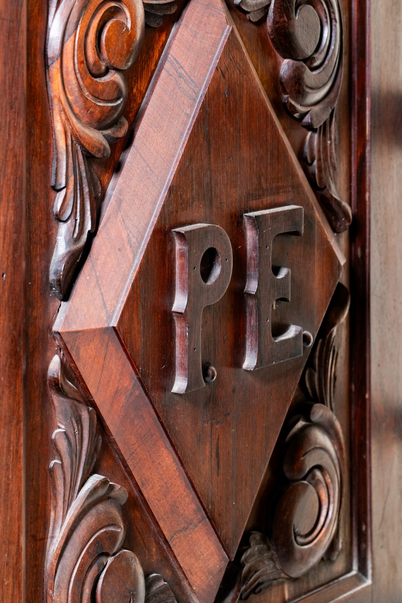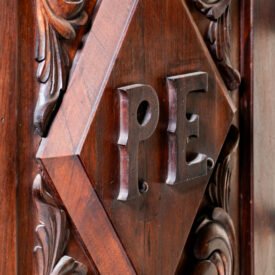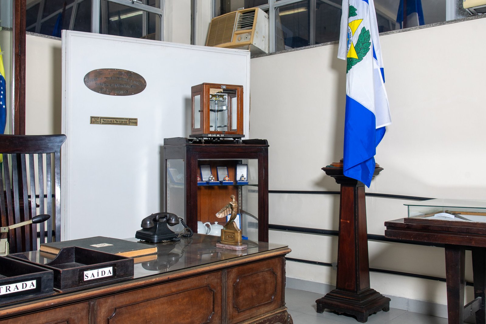 Objetos na mesa do Gabinete de Polícia, armário vitrine com insígnias e em cima uma balança. Ao fundo placas dos setores. Ao lado bandeira da Polícia Civil do Estado do Rio de Janeiro. Destaque para detalhe de parte do porta bandeira ao fundo (com Bandeira do Brasil) em madeira, entalhada, inscrição P.E.