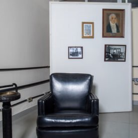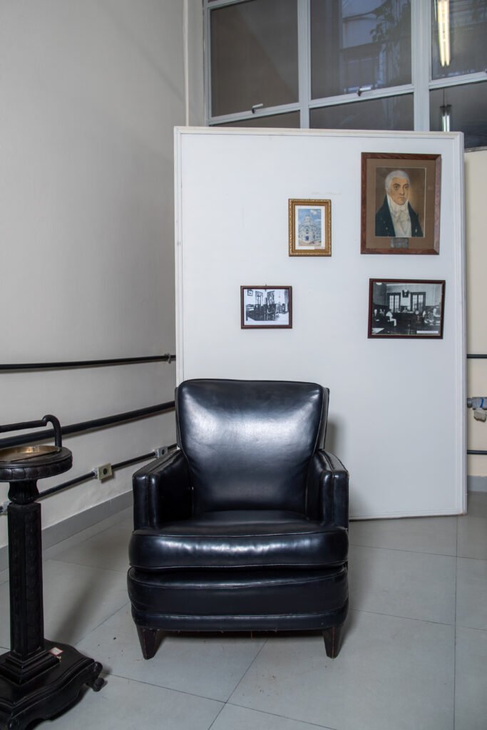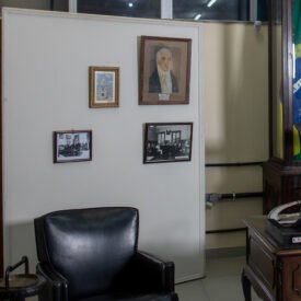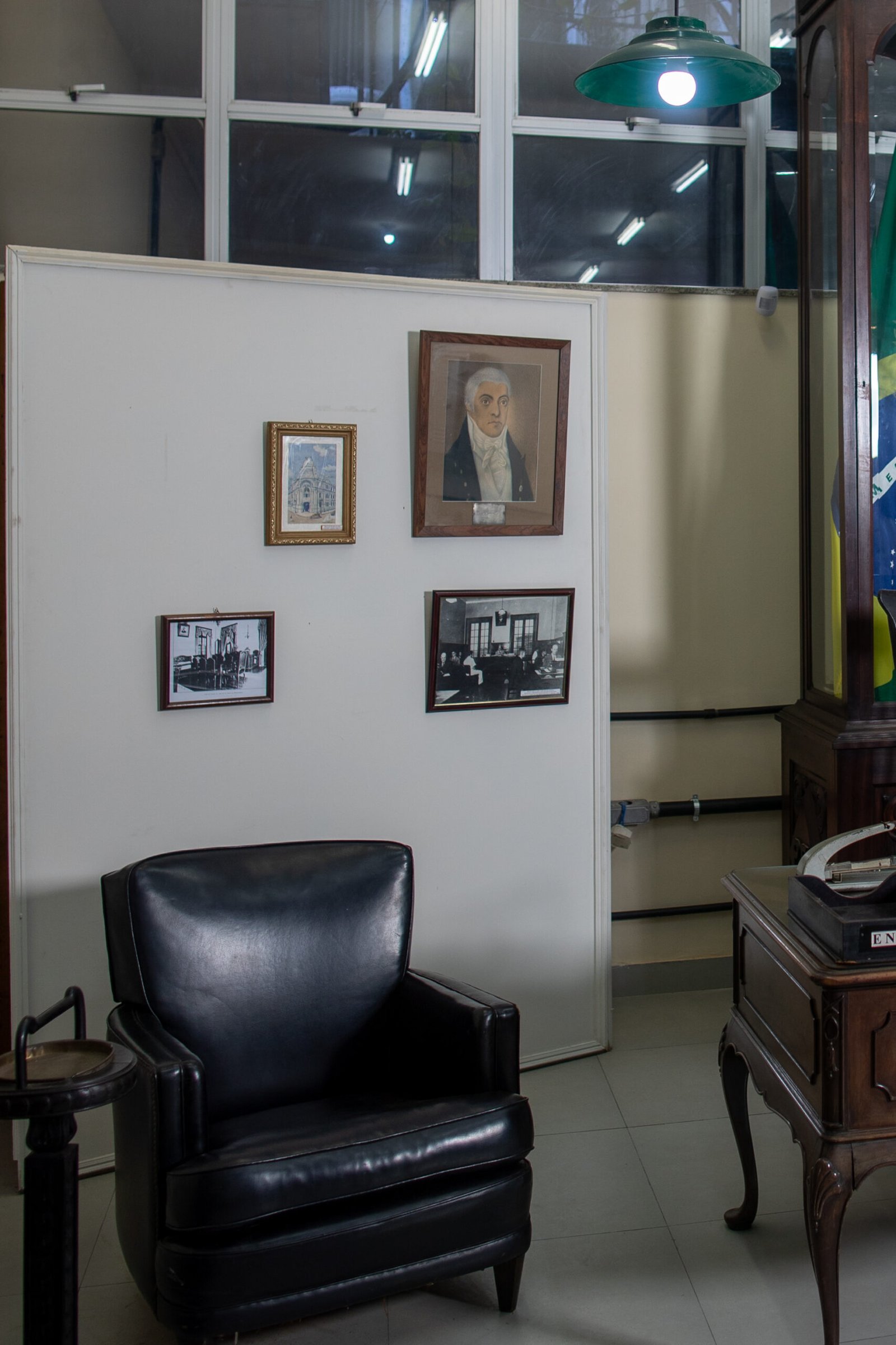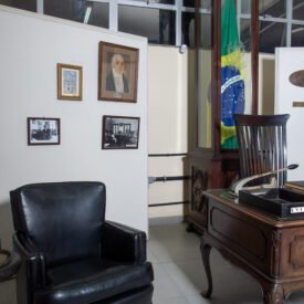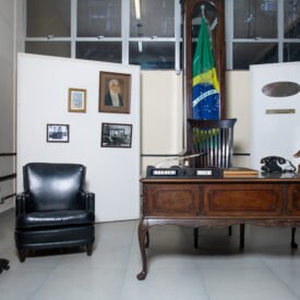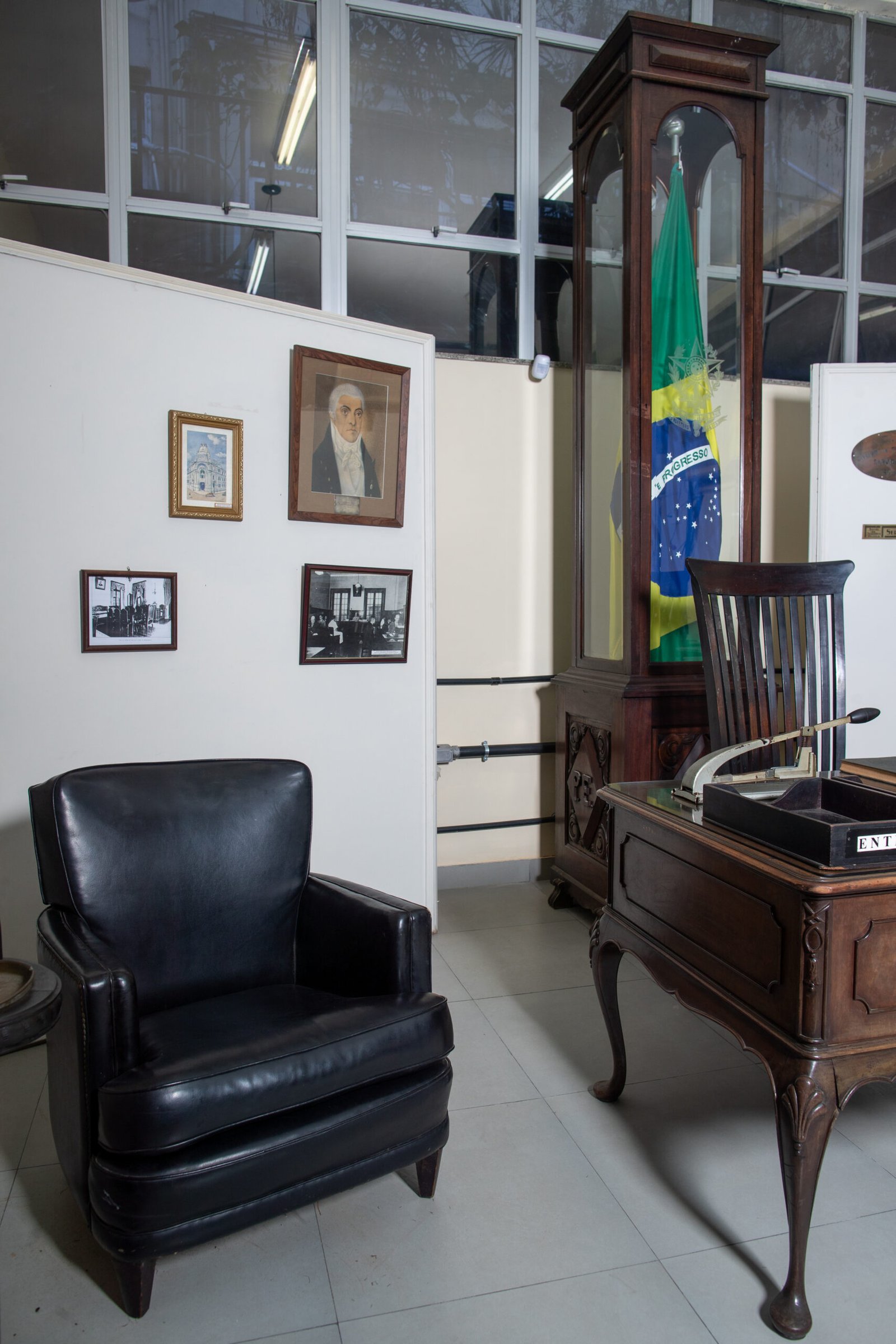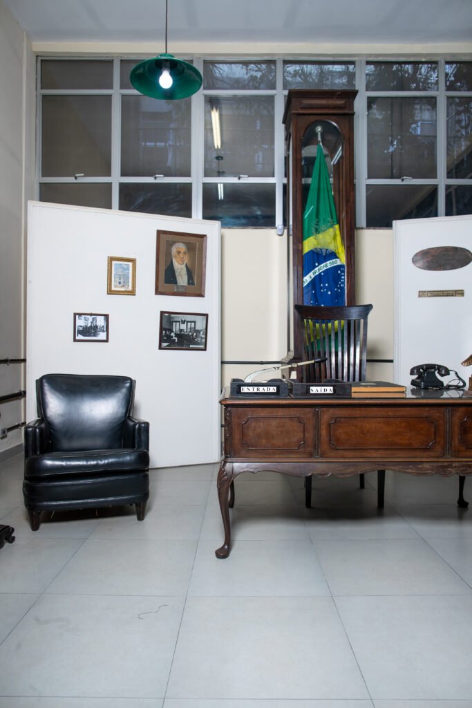 Representação do Gabinete de Polícia, destaque para poltrona e bandeira em vitrine.